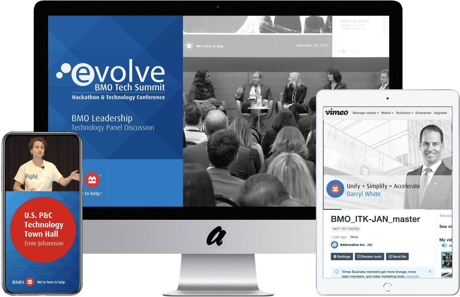 Addrenaline is the vendor of record for video production and capture for the employee experience business unit at BMO. This relationship has seen Addrenaline produce content for BMO Toronto and Chicago. Our work includes photography (office space and senior leadership headshots), videography including town hall capture and livestream, In The Know month in review, T-Talks technology video blogs, & event recaps including BMO's presence at Elevate Toronto and their own tech conference EVOLVE and the Employee Experience Summit.